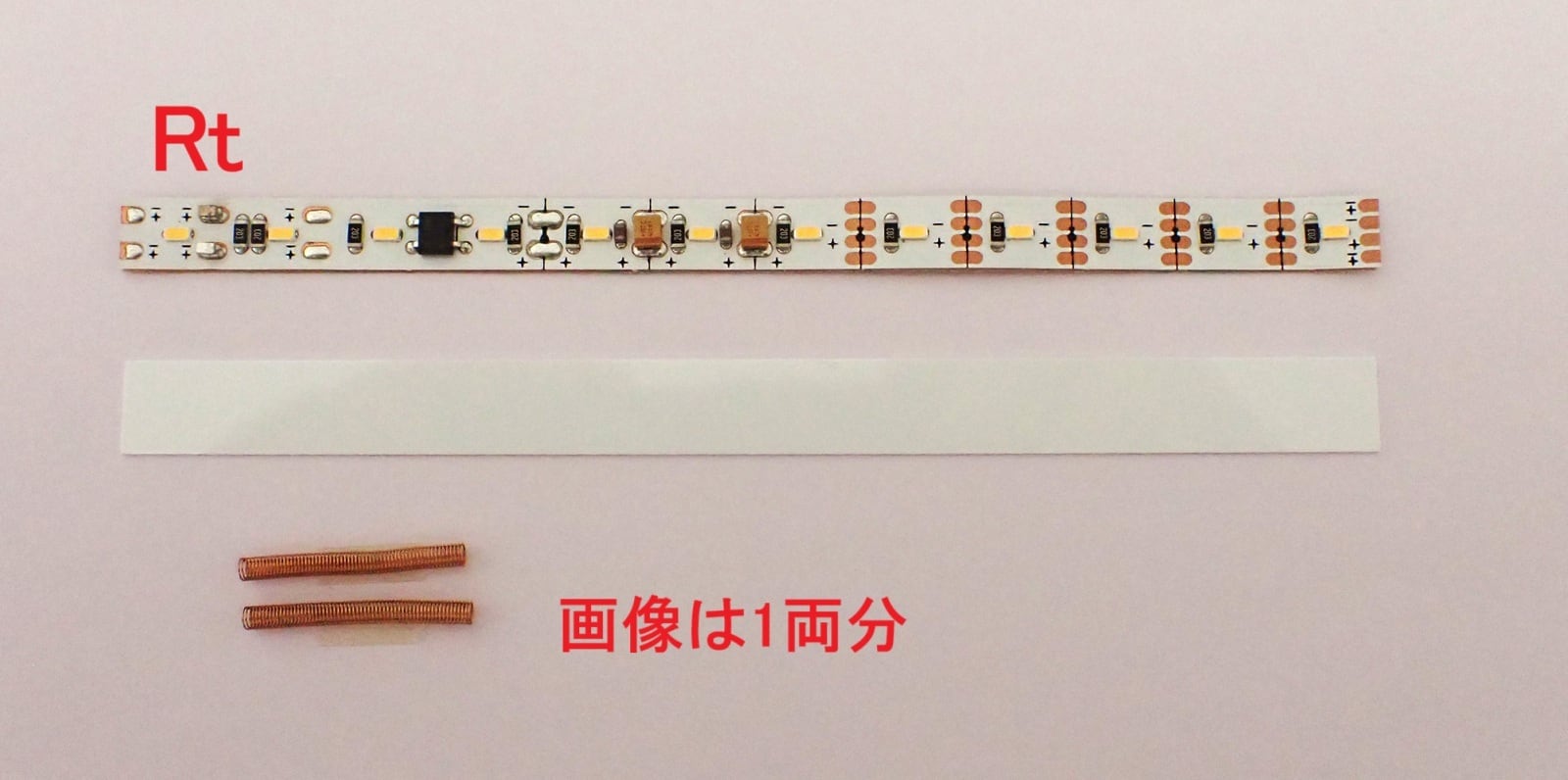 昼夜問わずちょうどいい明るさ! Nゲージ車両用新LED室内灯「グランライトⅢRt」ミドルチャージバージョン,トミックス用ハンダ付不要/簡単取付」10両セットと「グランライトⅢRm」ミドルチャージバージョン,マイクロエース他用ハンダ付不要/簡単取付」10両セットの登場です。通電OFF後数秒点灯します。走行時のチラツキなし。リニューアルした大容量高分子コンデンサー2個実装しております。TOMIXかMICOACE他の車両に取付ます。室内灯ユニットは幅8mm,厚さ1..0mm,長さ137.5mmでLED12個です。LEDは画像の通りでカットでき,通勤/近郊形から寝台車両などほとんどの車両に取付でき,車端まで均一に綺麗に点灯いたします。カットしたLEDは室内灯ユニットに追加,またはストラチャーなどに再利用できます。取付は付属の集電スプリングを指で摘まんで金具に嵌めるだけです。直接またはプラ板に貼って屋根裏に貼るか,またプラ板に貼って床下にセットしても出来ます。1両あたりの内容は室内灯ユニット(12LED) x 1 集電スプリング x 2, プラ板 x 1,最大消費電流は6mA/1両あたり。照度は通常とダークバージョンのほぼ中間の明るさになります。チラツキ防止コンデンサーを2個実装しております。点灯色は白色/ナチュラルホワイト色/電球色から選べます。スタンダードのコントローラーでも低速から点灯いたします。ぜひこの機会にアレンジを楽しんで、車両の魅力を引き立てましょう!