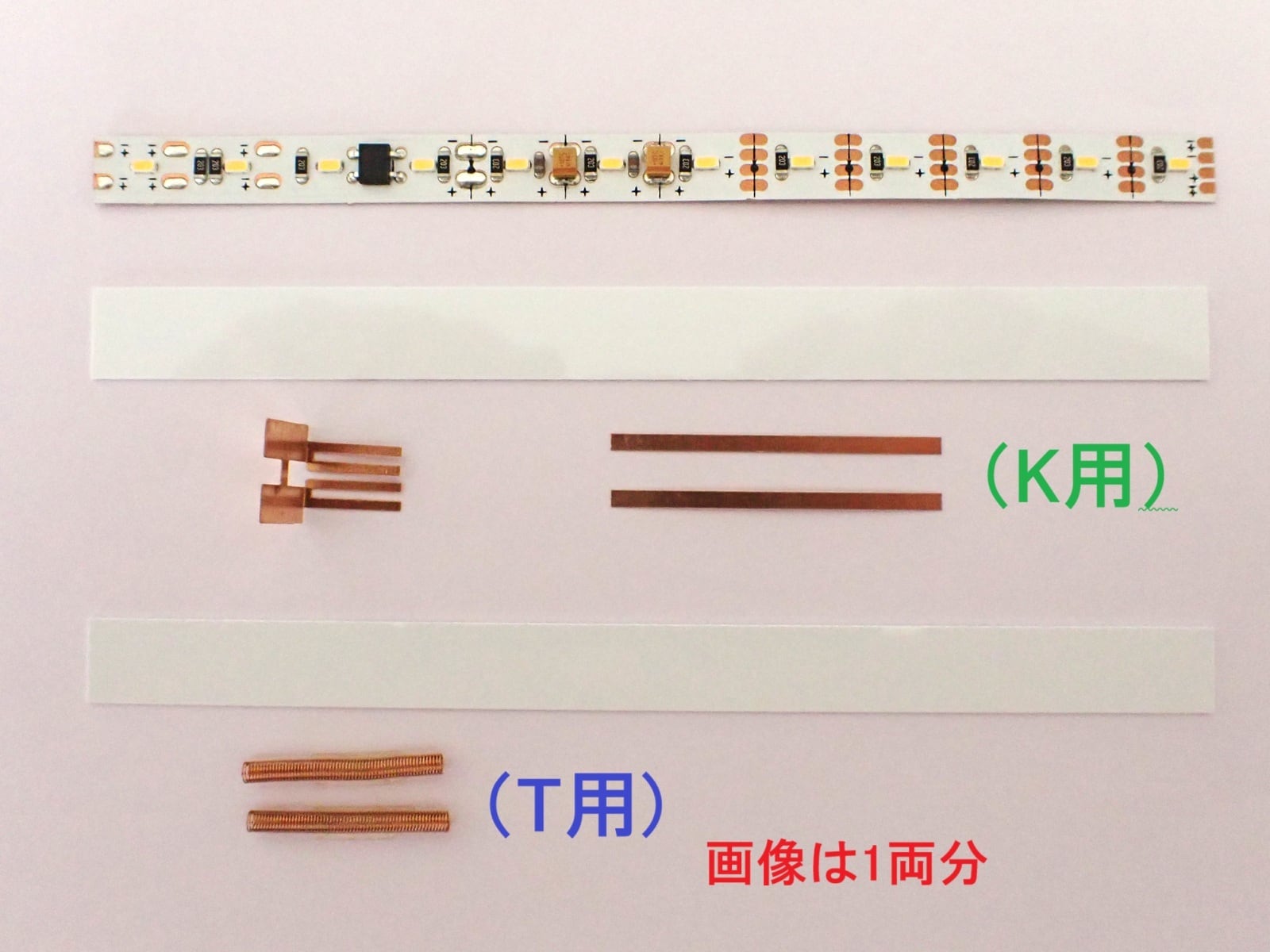 入力端子が端1カ所と中寄りに2カ所ありますので、集電位置より車端も点灯したい場合、中寄りの入力端子にKATO用は電極板をハンダ付、TOMIX/MICRO用は集電スプリングを中寄りの入力端子にハンダ付します。またユニットの先端にも入力端子があり車掌灯,前照灯などを直近で繋げられます。 1両あたりのキット内容は 室内灯ユニットx 1, KATO用(電極板 x 1, 集電シュー x 2)、TOMIX/MICRO用(集電スプリング x 2), プラ板 x 1, 最大消費電流は1両あたり6mA。照度はグランライトⅢ通常とダークバージョンのほぼ中間の明るさになります。チラツキ防止コンデンサーを2個実装しています。スタンダードのコントローラーでも低速から点灯いたします。点灯色は白色/ナチュラルホワイト色/電球色から選べます。