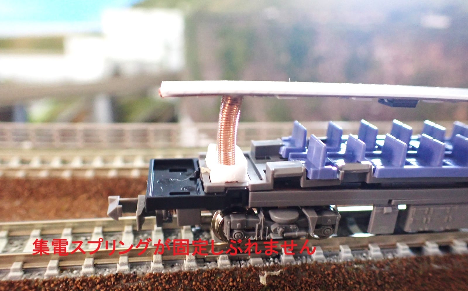 スプリングずれんゾウを車端の集電部分に嵌めるだけ。室内灯に取り付けた集電スプリングを入れます。