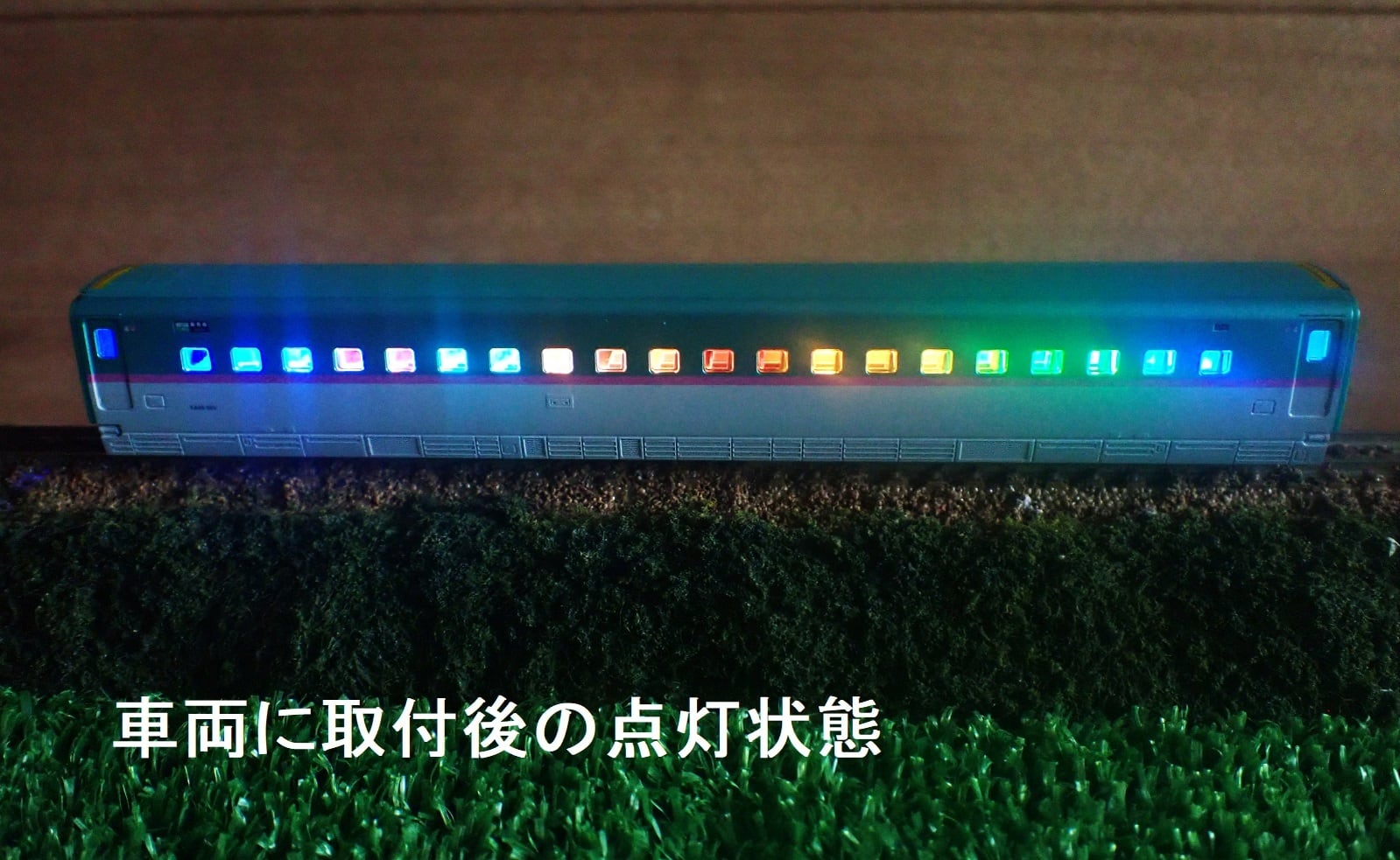 Nゲージ車両用新LED室内灯「グランライトⅡロングレインボー」10両セットです。KATO/TOMIX/MICROACEの車両共用に使用できます。LEDが多色に変化し点滅します。室内灯ユニットは幅8mm,厚みは最大1.5mm,LED1.0mm,長さ137.5mmでLED12個です。LEDは画像のとおりカットできます。車端まで均一に点灯します。簡単なハンダ付が2カ所必要です。入力端子が端と中寄りに2カ所ありますので、集電位置より車端も点灯したい場合、中寄りの入力端子にKATO用は電極板をハンダ付します。TOMIX/MICRO用は集電スプリングを中寄りの入力端子にハンダ付けします。1両あたりのキット内容は室内灯ユニットx 1, KATO用(電極板 x 1, 集電シュー x 2),TOMIX/MICRO用(集電スプリング x2),プラ板 x 1, 最大消費電流は1両あたり50mA。チラツキ防止コンデンサーを2個実装しています。スタンダードのコントローラーも低速から点灯いたします。カトー用の取付金具もしくはトミックス/マイクロエース用取付集電スプリングから選べます。車両に取付後の点灯動画はXの@shoryulightでご覧いただけます。