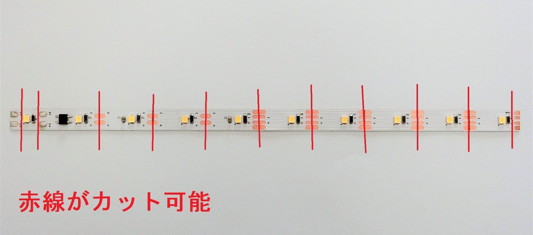 16番ゲージ車両用LED室内灯「グランライトHO(T)」です。長さ238mm,幅10mmにLEDが10個配置しており,両端も均一に点灯できます。厚み最大1.5mm,LEDは1.0mmです。また先端にも電極ターミナルを付けましたので、ヘッド/テールライト/方向灯、集電配線が短くなり引き回しがなくなりました。赤線部分で切って短くして、あるいは追加して長くして使うこともできます。各間の電極より電気をとることもできます。ハンダ付けが2か所必要です。