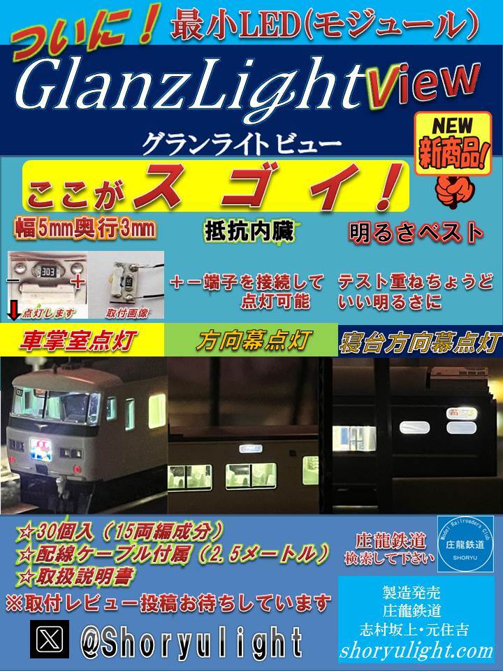 グランライトシリーズの室内灯ユニットの端子に追加して側面方向幕点灯や車掌室点灯などが簡単な配線で取付できます。N/16番ゲージ兼用。セット内容(図1)はグランライトビューユニット(図2) x 30個, 極細ケーブル 2.5m x 1個, 取扱説明書 x 1, 取付方法 1.極細ケーブルをユニットの長さ+αにカットしてユニットに繋ぎます(図3)。側面方向幕点灯は図4の通り配線,車掌室点灯は図4の通り配線します。